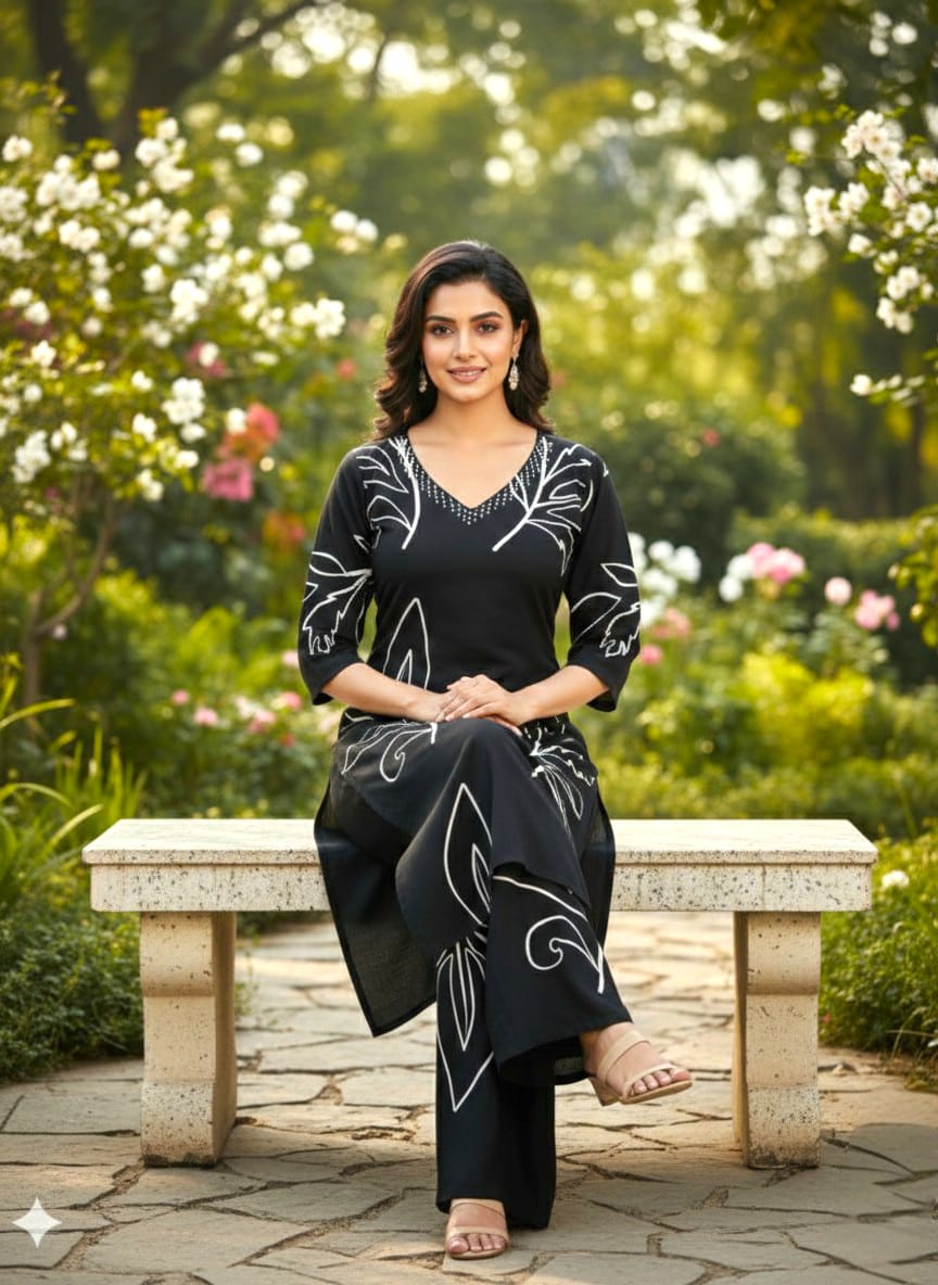 Elevate your everyday style with this effortlessly chic black kurta palazzo set crafted in soft and breathable Rayon fabric. Designed for comfort with a modern touch, the kurta features bold white leaf prints that create a striking contrast against the black base.