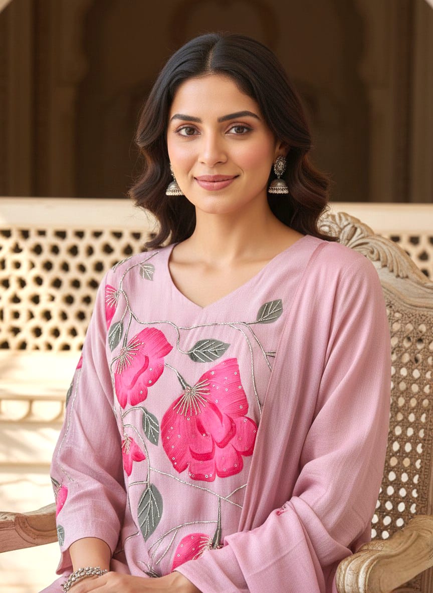 Grace meets elegance in this beautiful blush pink Chinon A-line kurta set, designed with eye-catching floral hand embroidery. The soft pastel base combined with bold pink flower detailing creates a fresh and feminine look.