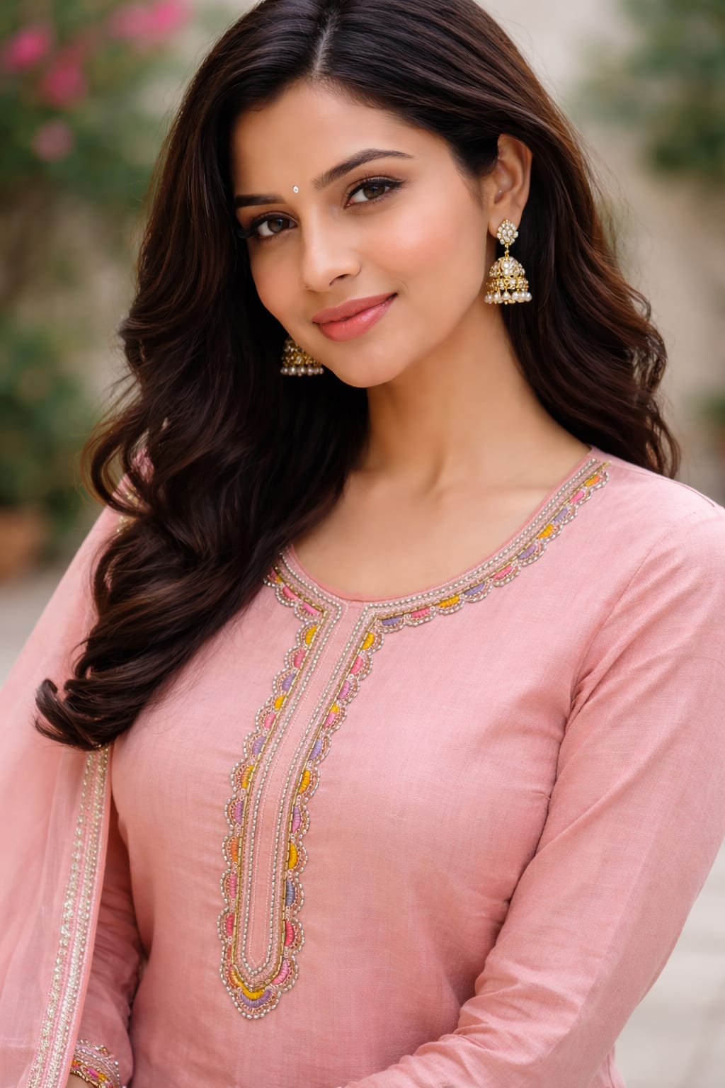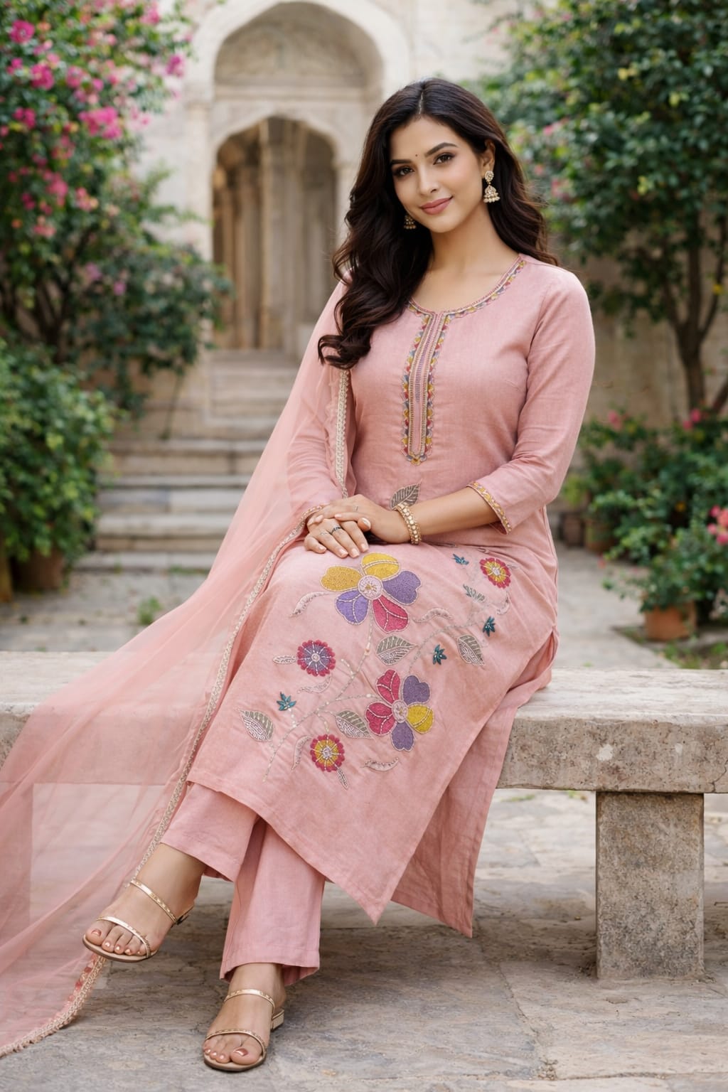 Elevate your ethnic wardrobe with this elegant blush pink kurta set crafted in premium Roman silk fabric. Designed with intricate multicolor hand work embroidery on the front, this ensemble beautifully blends traditional charm with contemporary grace.