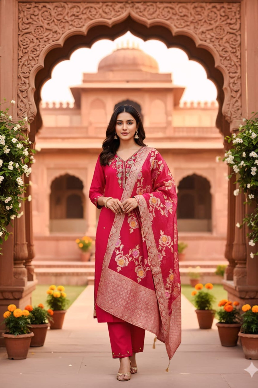 Make a statement with this vibrant Rani Pink ethnic suit set, designed to add grace and elegance to your festive wardrobe. This three-piece ensemble combines traditional embroidery with luxurious fabric textures