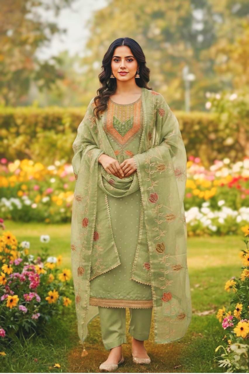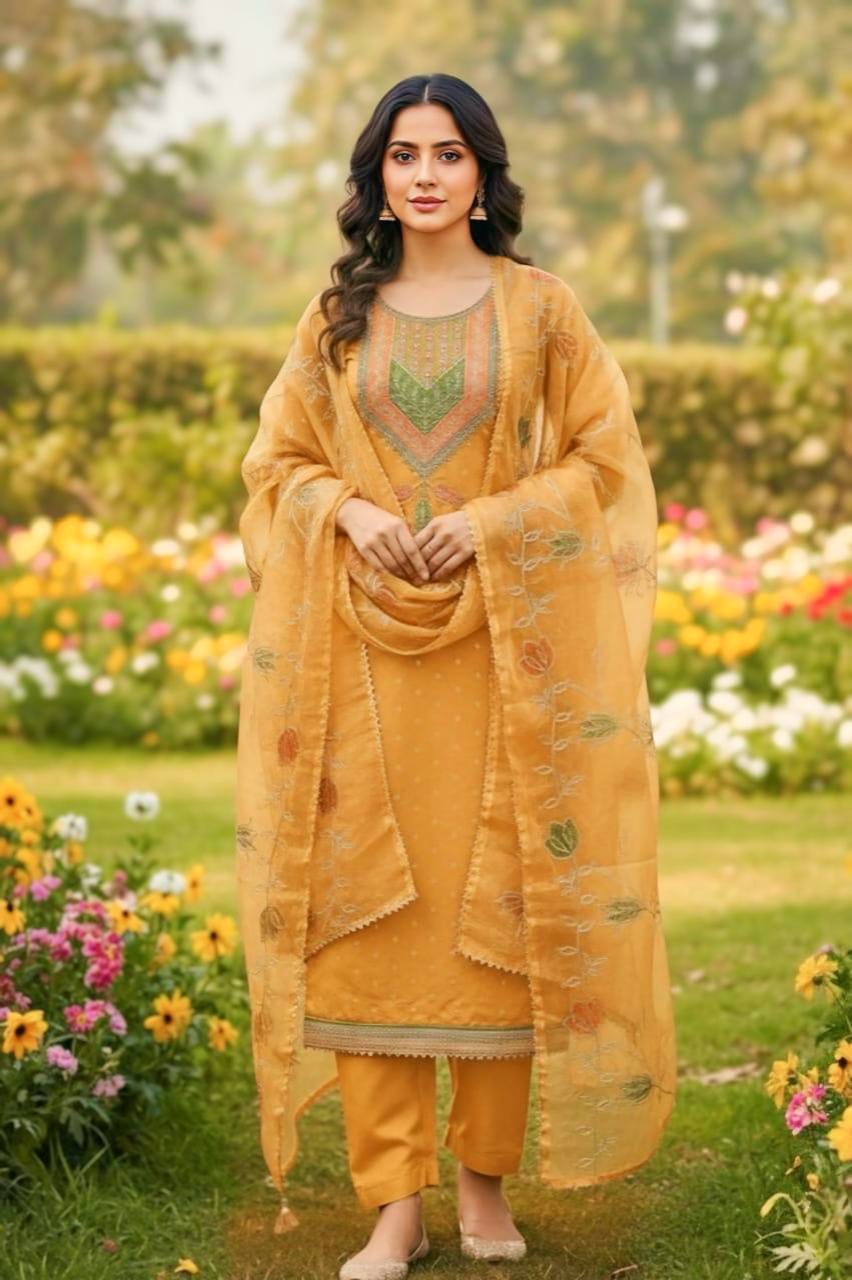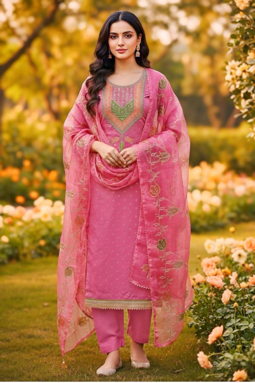 Grace your festive wardrobe with this stunning Chanderi embroidered suit set, designed to exude charm and sophistication. The soft Chanderi kurta features intricate thread and zari embroidery on the neckline with delicate sequin highlights, creating a timeless ethnic appeal.