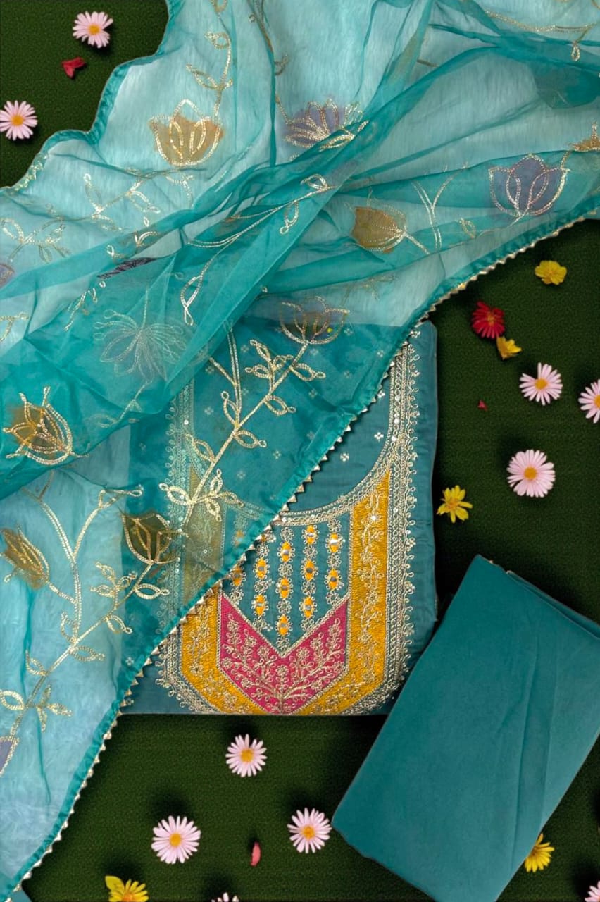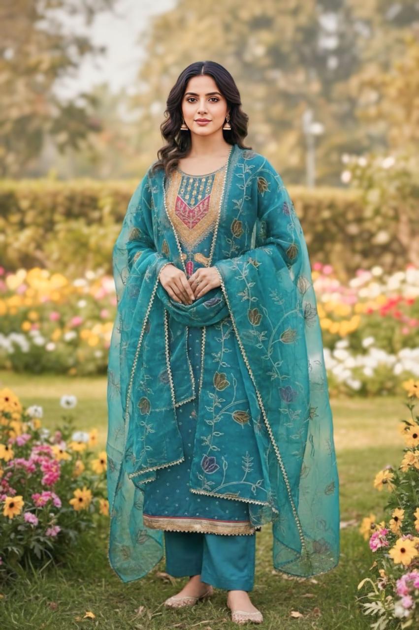Available in elegant pastel shades — sea green, teal blue, pink, and mustard yellow — this outfit is perfect for festive celebrations, weddings, or family gatherings.