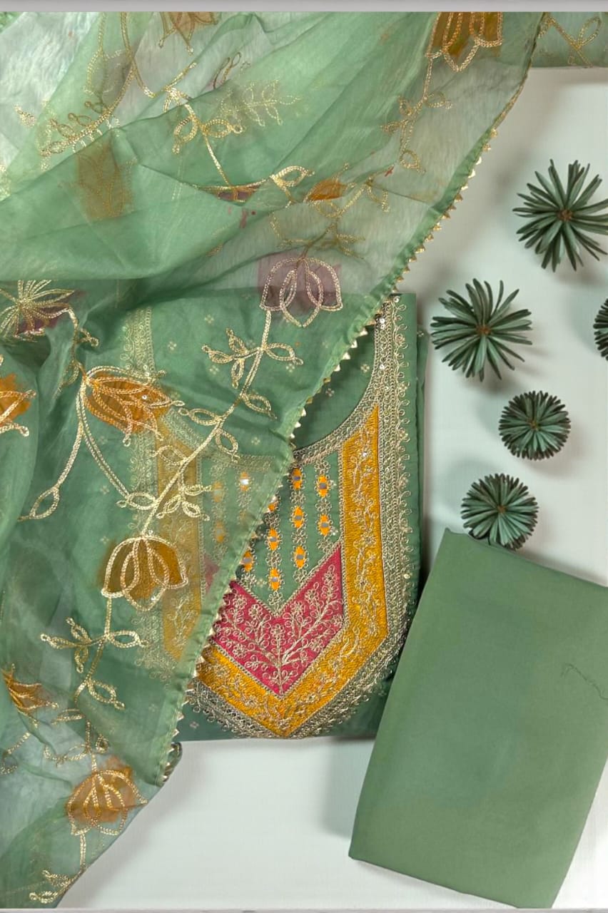 Paired with a beautifully crafted organza dupatta adorned with multicolor floral embroidery and scalloped lace border, this ensemble brings together tradition and elegance effortlessly.