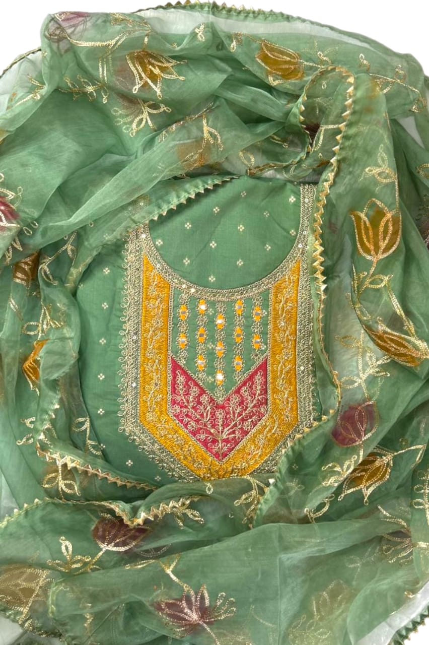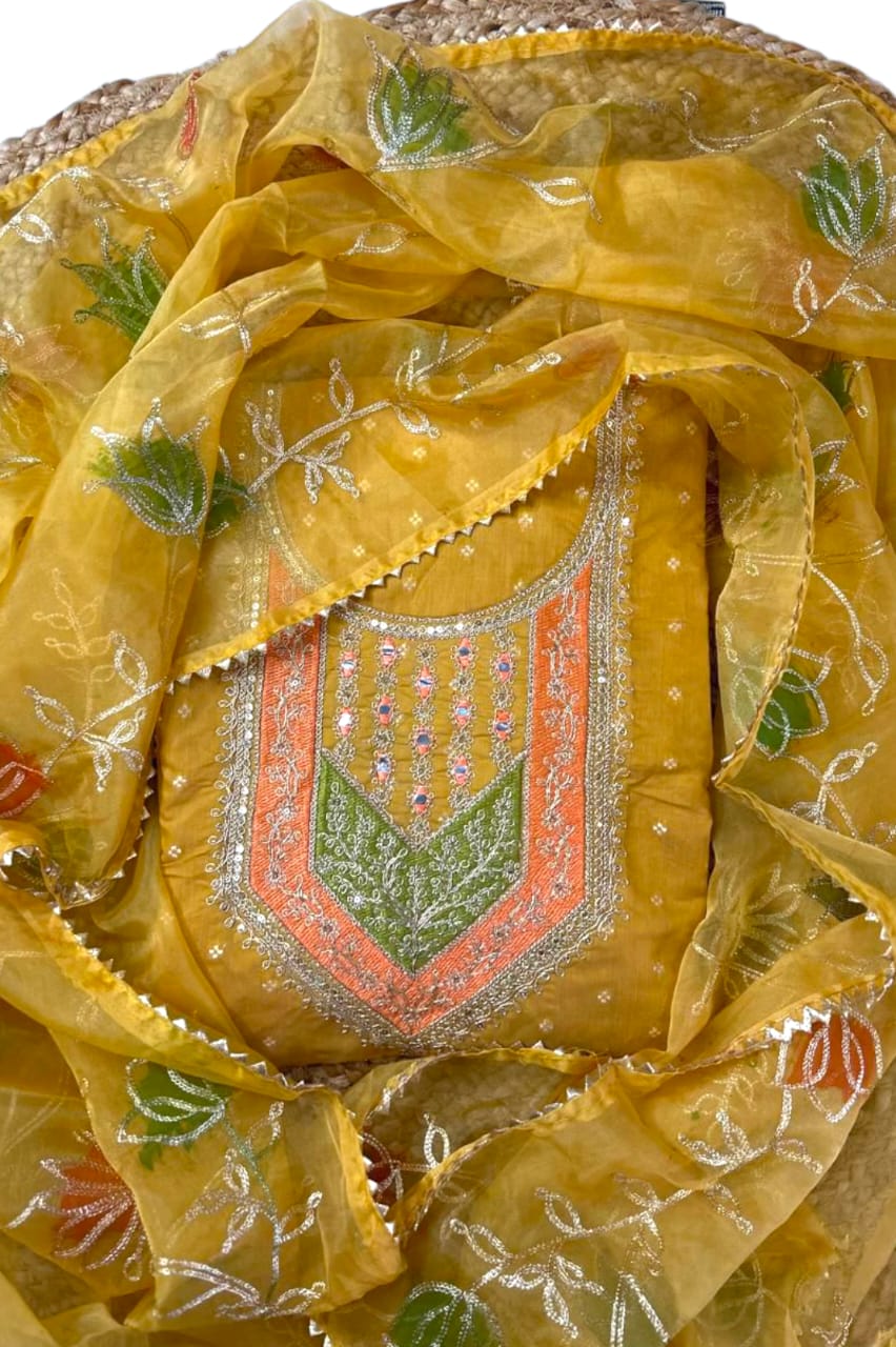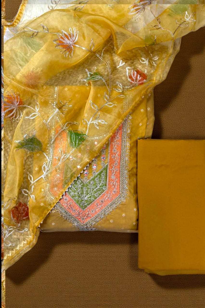Dupatta: Soft organza with multicolor floral embroidery and scalloped border