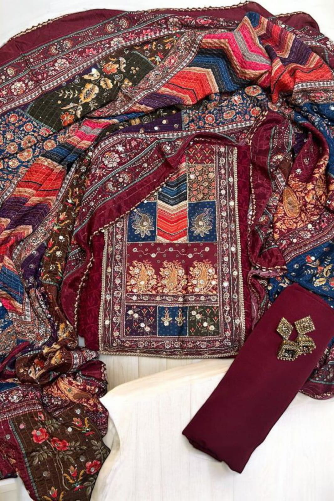 Add a regal flair to your wardrobe with these stunning unstitched suits bursting with cultural richness and traditional elegance, available in five vibrant shades: black, blue, maroon, green, and purple. Each suit features intricate traditional embroidery, ornate patterns, and multicolor detailing that add a luxurious touch. Adding an elegant touch to the ensemble is the lavishly embroidered dupatta with mirror work, making it perfect for festive occasions, family gatherings, or cultural celebrations.
