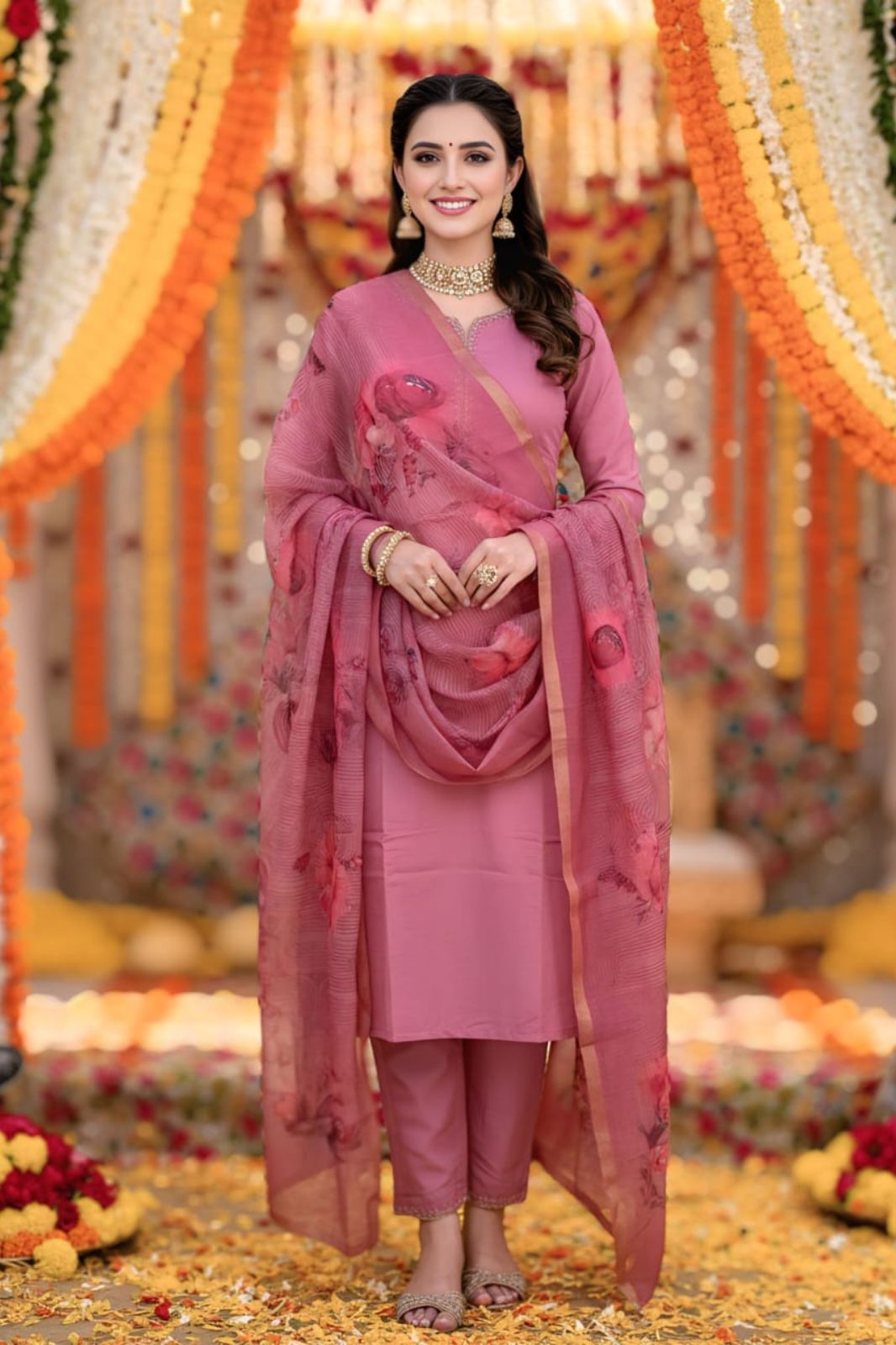 Step into timeless elegance with this pink silk blend suit set, designed for both festive and formal occasions. The kurta features subtle embroidery along the neckline adding a graceful touch. Paired with straight-cut pants for comfort and sophistication, the set is elevated by a beautifully printed dupatta that enhances the overall charm. Perfect for weddings, celebrations, or evening gatherings, this outfit blends tradition with contemporary finesse.