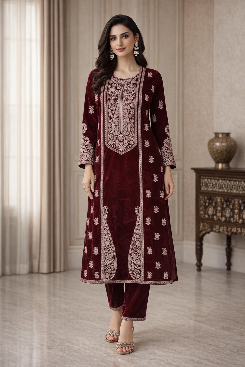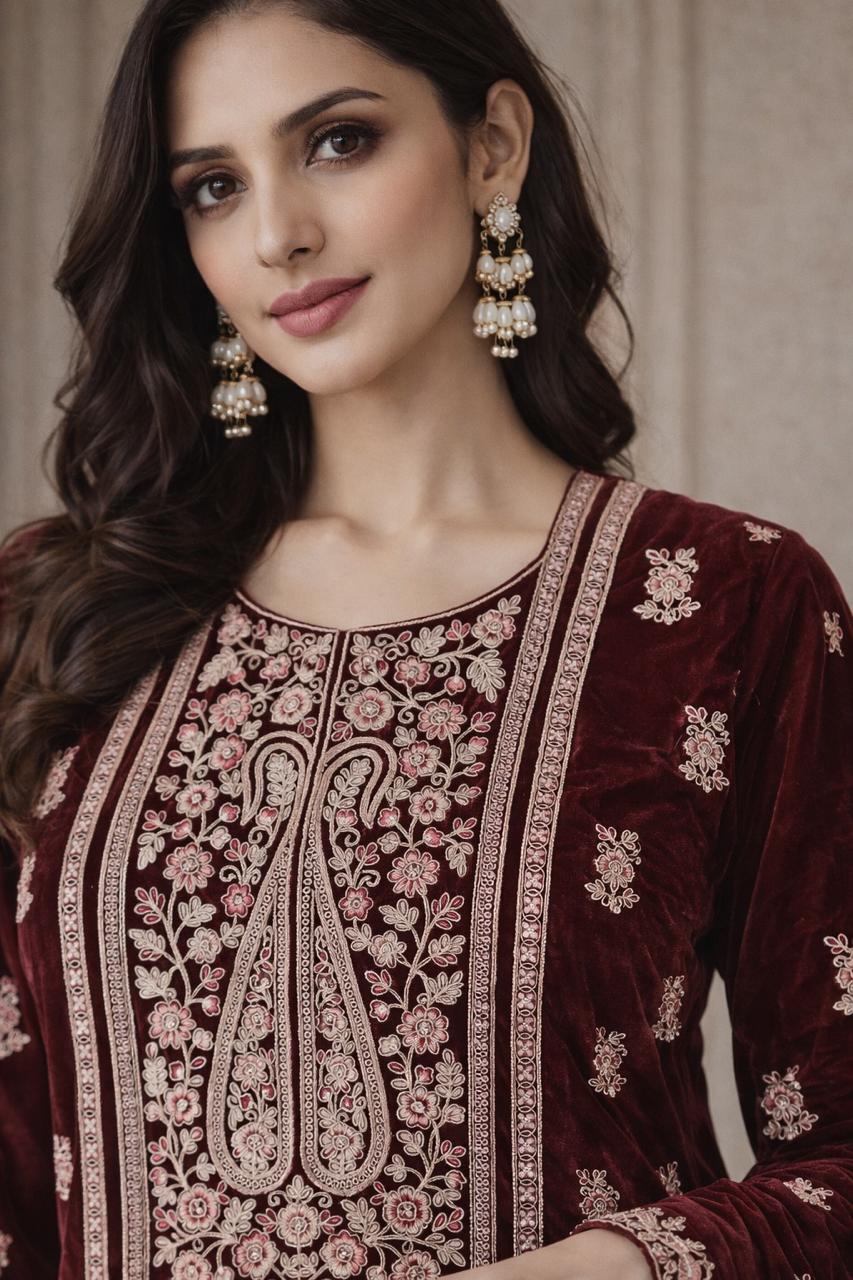 Elevate your festive and evening wardrobe with this luxurious maroon velvet suit set, designed to make a statement with timeless elegance. Crafted in rich velvet fabric, the kurta features intricate embroidery on the neckline, hem, and borders, adding a regal touch to the silhouette. The matching velvet dupatta is beautifully adorned with delicate motifs and an embroidered border, perfectly complementing the ensemble.