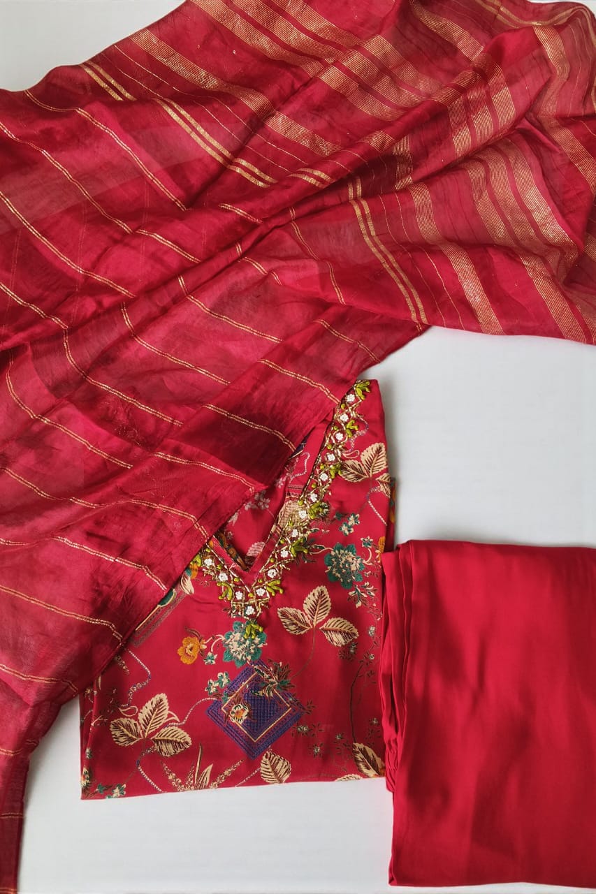 A graceful maroon red mul cotton suit set adorned with a delicate embroidered neckline and soft striped dupatta. Perfect blend of comfort and festive charm — ideal for celebrations and ethnic gatherings.