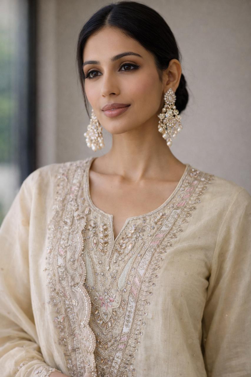 Exude timeless grace with this Ivory Shimmer Kurta Set, designed for effortless elegance and comfort. Crafted from soft shimmer fabric, the kurta features intricate embroidery along the neckline, panels, sleeves, and scalloped hem, creating a refined festive appeal.