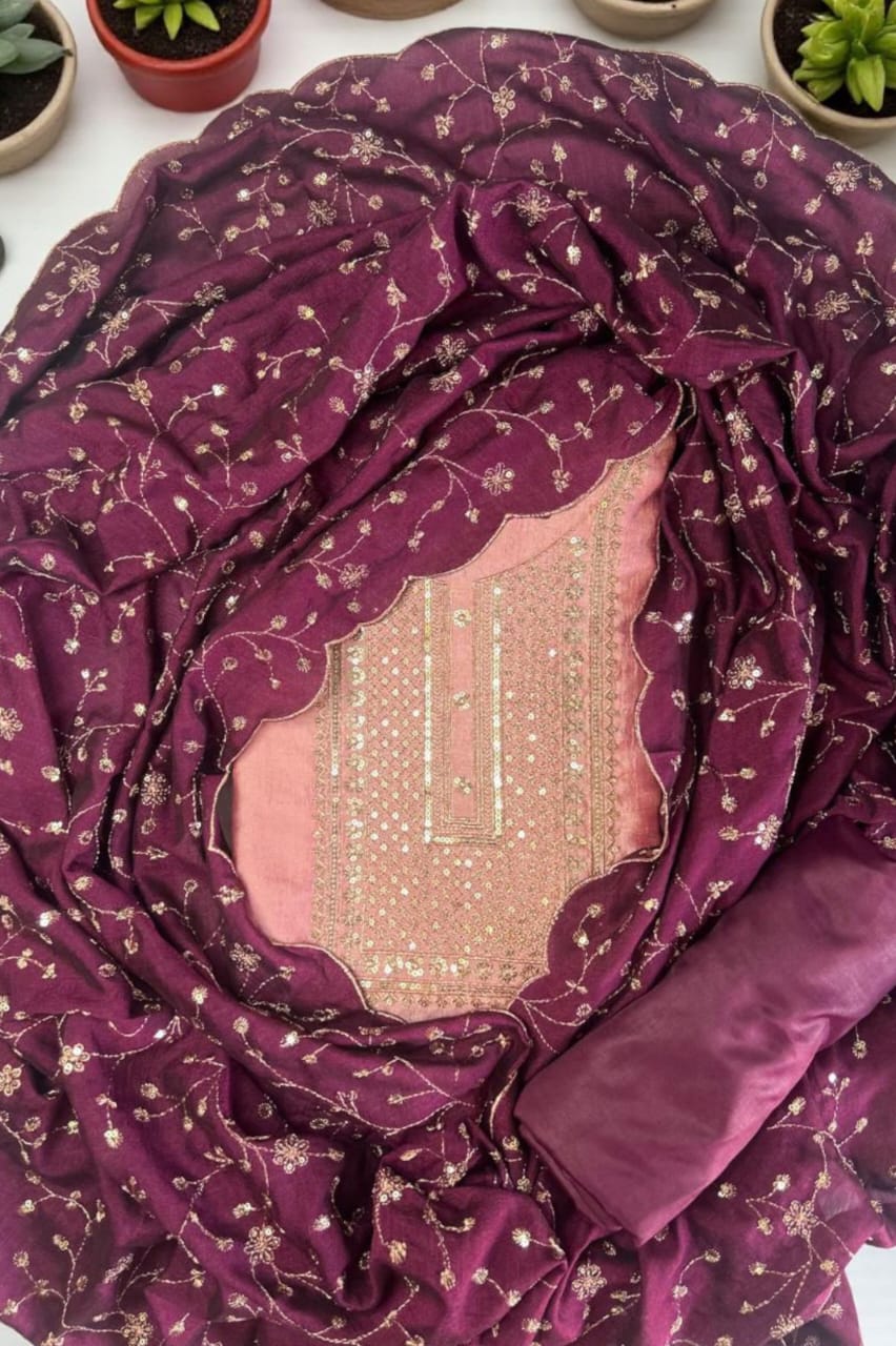 Embrace elegance with this stunning Vichitra silk Unstitched suit in a rich shades. The kameez features intricate embroidery with thread work, giving it a sophisticated festive charm. The highlight of this set is its beautifully embroidered dupatta with scalloped edges and floral motifs, adding a royal and graceful touch. Paired with a matching plain bottom fabric, this unstitched suit set is perfect for festive gatherings, parties, and wedding celebrations.