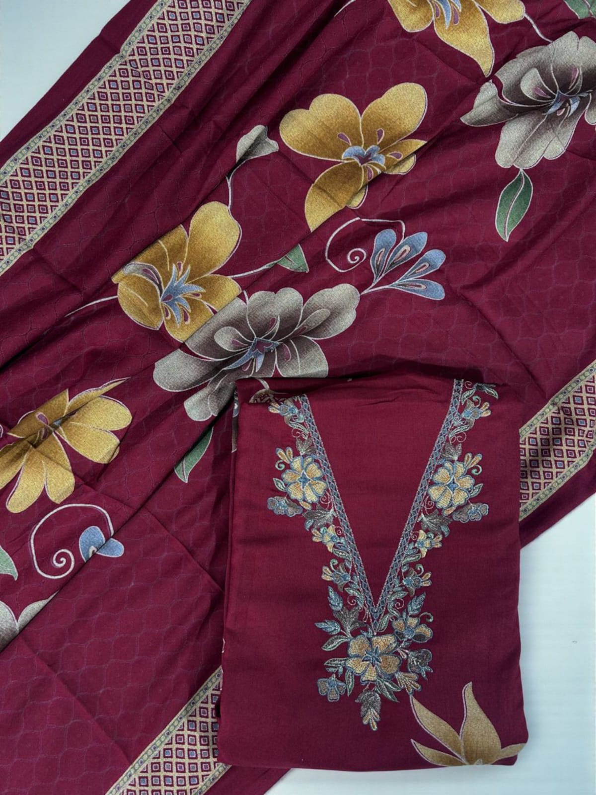 This vibrant maroon Pashmina suit stands out with its beautifully embroidered V-neckline and floral motifs. The printed detailing on the suit and dupatta adds charm, making it ideal for winter festivities or daily ethnic wear.