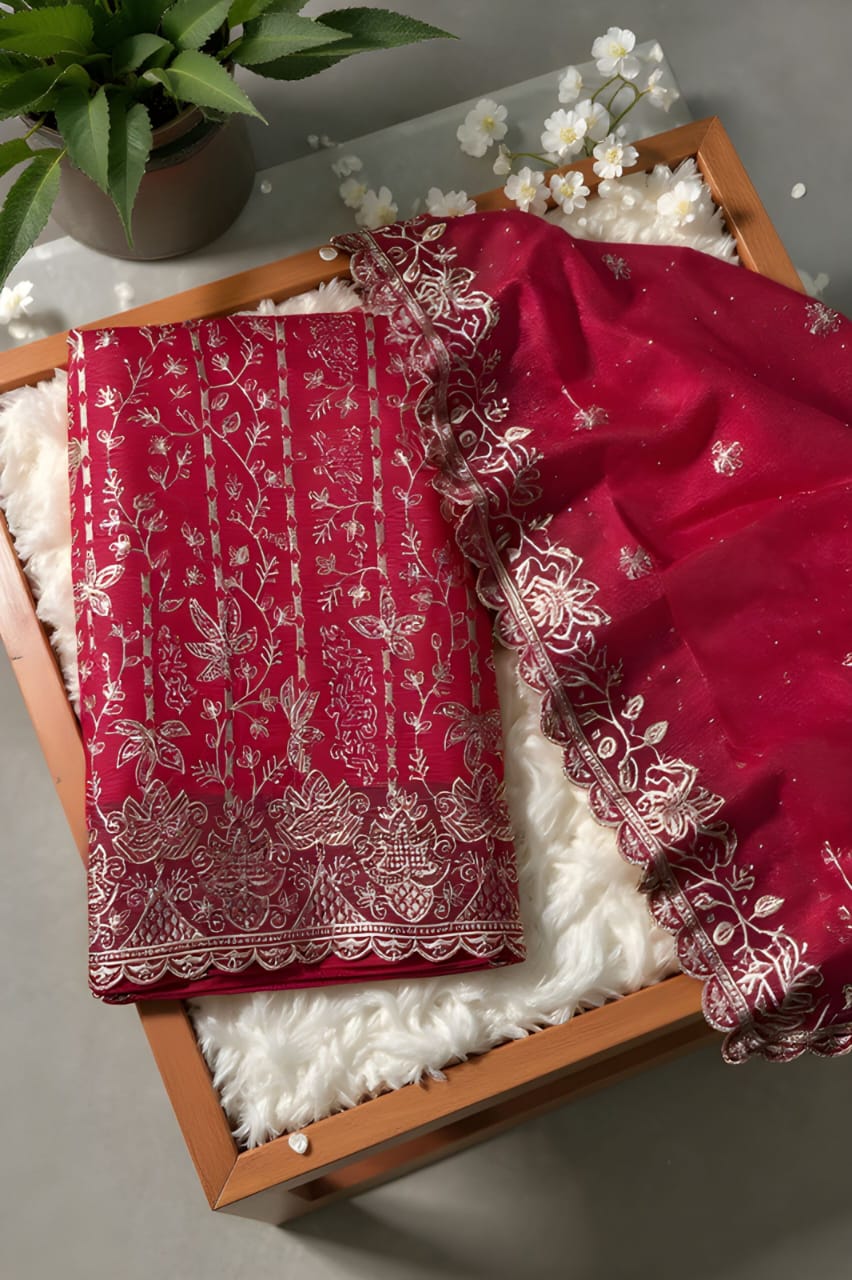 Step into timeless sophistication with this graceful Kota Silk Unstitched Suit in classic shades. The kameez is adorned with intricate thread and zari embroidery, creating a refined and festive look. The matching dupatta, crafted in lightweight Kota silk, features elegant embroidered motifs and a detailed border that adds to its luxurious charm. Paired with a plain matching bottom fabric, this unstitched suit set is perfect for weddings, festive occasions, and evening gatherings, giving you a royal yet effortless elegance.