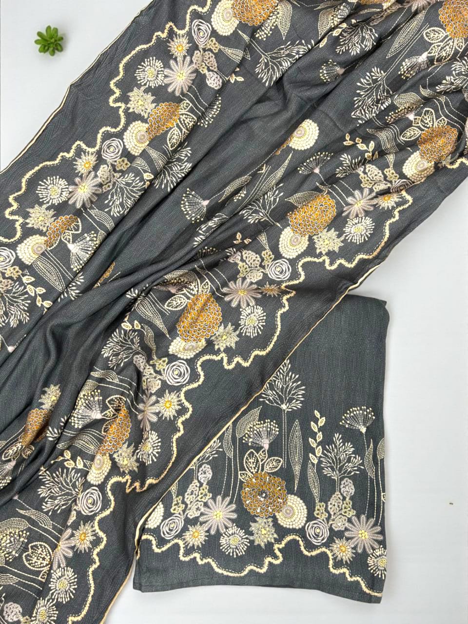 Crafted in a soft, cozy pashmina fabric, this suit features beautiful floral print detailing paired with delicate thread embroidery. The rich Grey base with golden and pastel motifs gives it a luxurious, festive look—perfect for casual outings, office wear, or small winter gatherings.