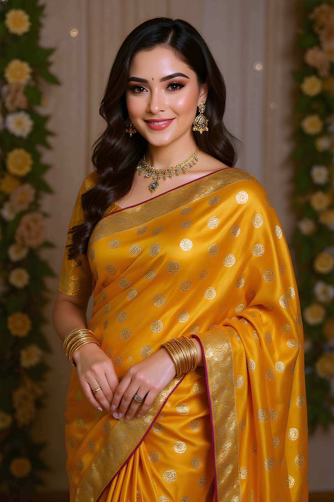 Step into the spotlight with this vibrant yellow Banarasi Katan Silk Saree, exquisitely adorned with classic zari polka dots across the body. The timeless charm of this saree is elevated by a finely woven zari border and pallu, featuring intricate traditional motifs. With its lustrous sheen, lightweight drape, and regal detailing, this saree is a celebration of craftsmanship and heritage—perfect for festive occasions, weddings, and cultural events.