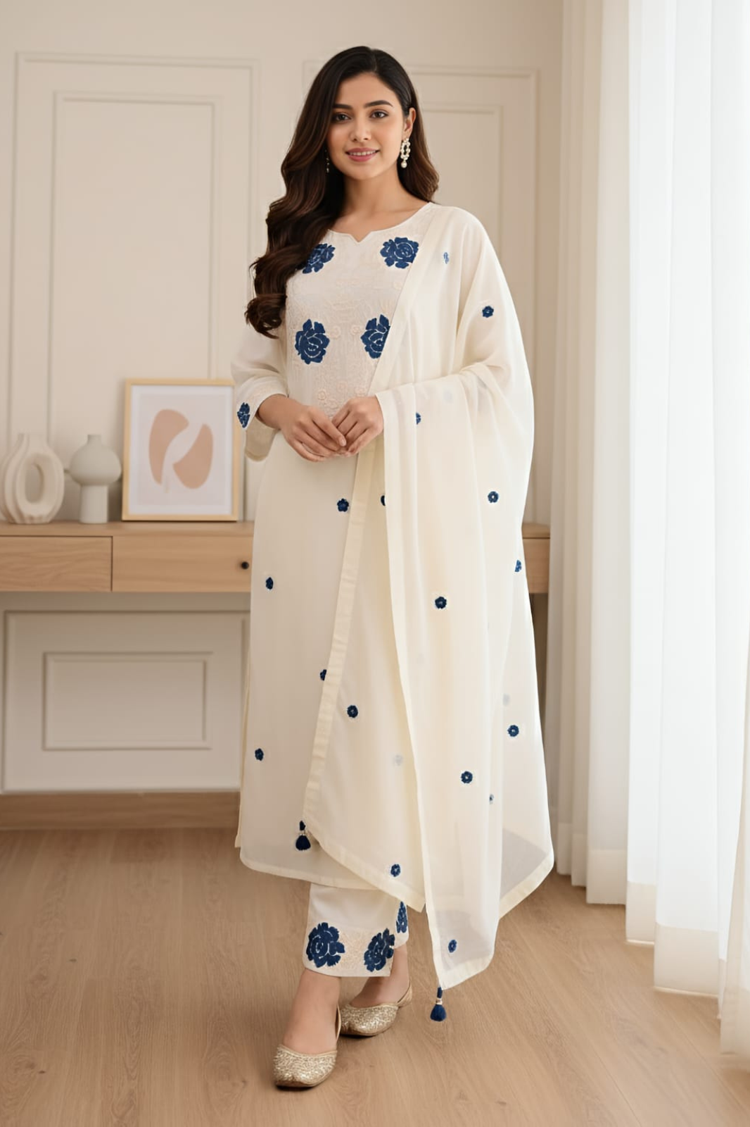 Elevate your everyday ethnic style with this graceful ivory kurta set crafted from breathable rayon slub fabric. The kurta features delicate blue floral embroidery across the yoke and scattered motifs that add a touch of charm and freshness. Paired with matching straight-fit pants detailed with coordinated embroidery and a soft dupatta adorned with minimal motifs, this ensemble offers effortless elegance and all-day comfort. Perfect for casual gatherings, festive mornings, and refined day wear.