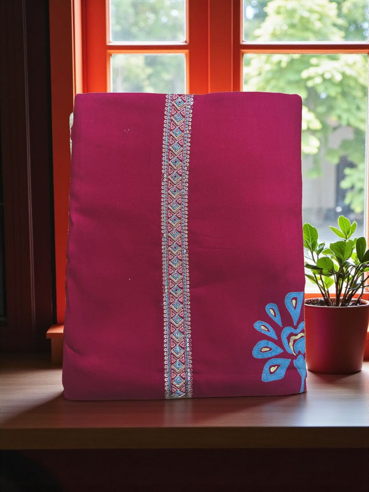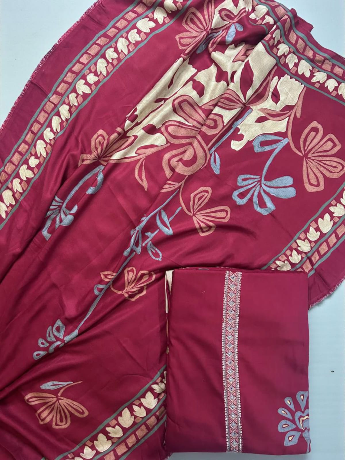 This rich red Pashmina suit stands out with its bold colour and intricate embroidered neckline. The soft printed suit and matching printed dupatta make it an eye-catching winter outfit that blends comfort with festive charm.