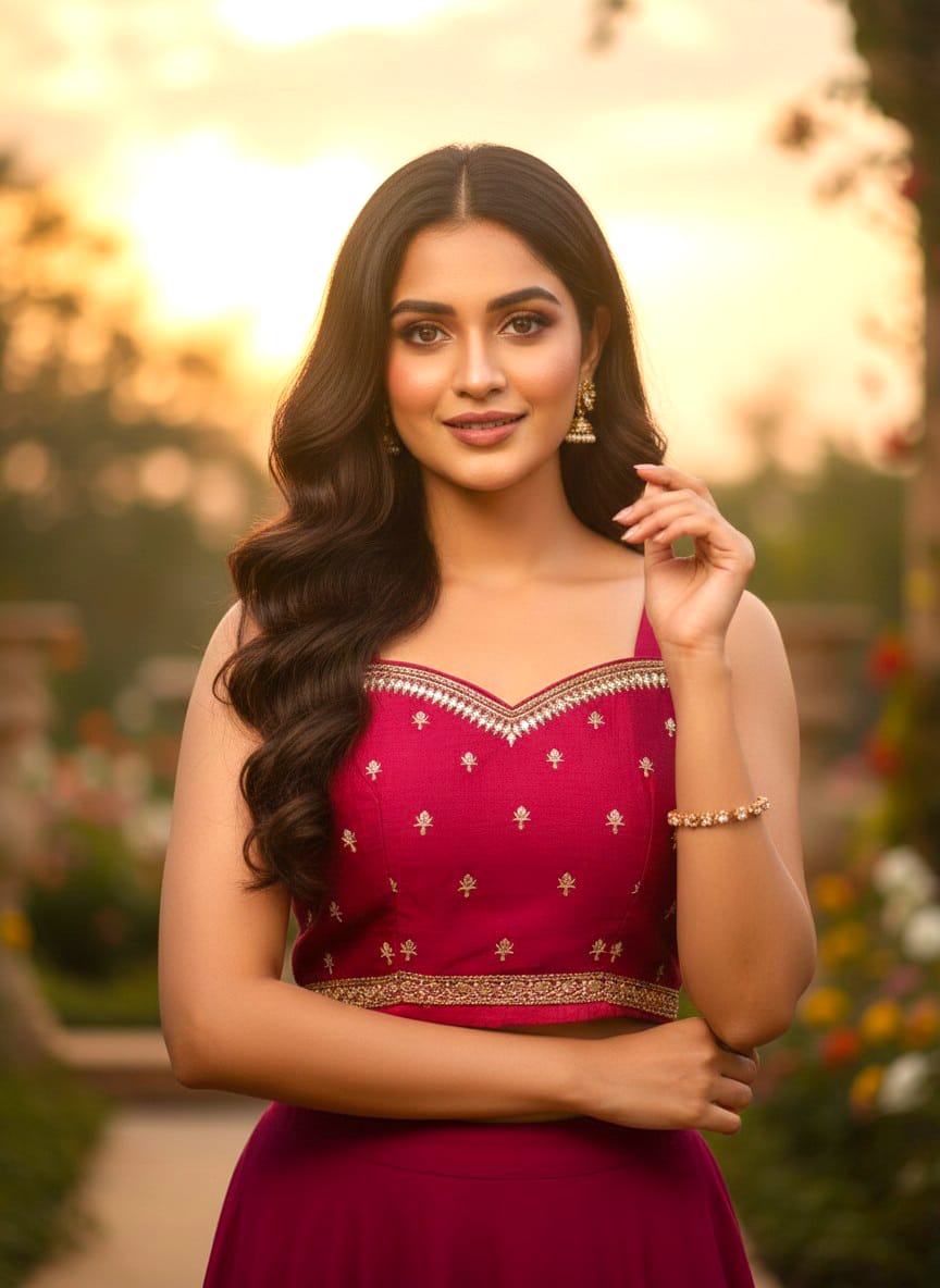 Exude timeless royal elegance with this stunning majenta silk lehenga set, designed for grand celebrations. The outfit features a beautifully flared silk lehenga paired with a matching embroidered blouse and a heavily embellished short jacket.