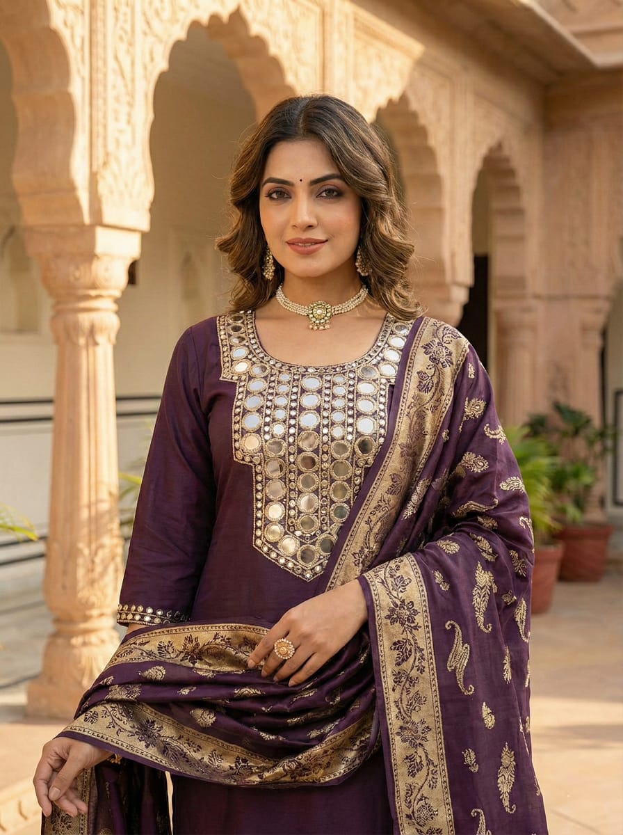 Step into timeless elegance with this Royal Purple Silk Mirror work Kurta Set, crafted for women who appreciate heritage luxury with modern grace. The rich silk fabric is adorned with intricate Mirrors and traditional embroidery on the neckline, exuding regal charm and sophistication. Paired with a beautifully woven Banarasi-style dupatta featuring paisley and zari detailing, this ensemble is perfect for weddings, festive celebrations, and special occasions.
