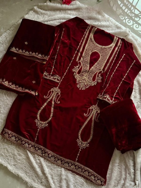 Exude timeless sophistication with this luxurious maroon velvet unstitched suit set, designed for refined festive and occasion wear. Crafted in rich, soft velvet, the kurta features intricate golden embroidery on the neckline, sleeves, side panels and hem, creating a regal and graceful silhouette. The coordinated velvet bottom complements the ensemble, while the matching embroidered velvet dupatta adds an elegant finishing touch.