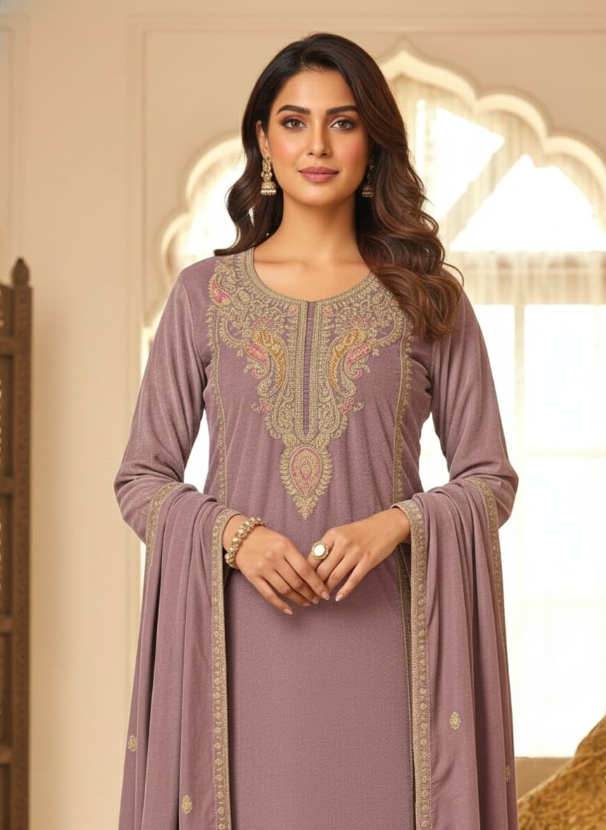 Embrace understated elegance with this graceful mauve velvet unstitched suit set, designed for refined festive and occasion wear. Crafted from soft, premium velvet, the kurta is beautifully adorned with intricate embroidery on the neckline and front panel, lending a delicate yet luxurious appeal. The coordinated velvet bottom complements the ensemble perfectly, while the matching dupatta, detailed with subtle motifs and an elegant border, adds a touch of sophistication.
