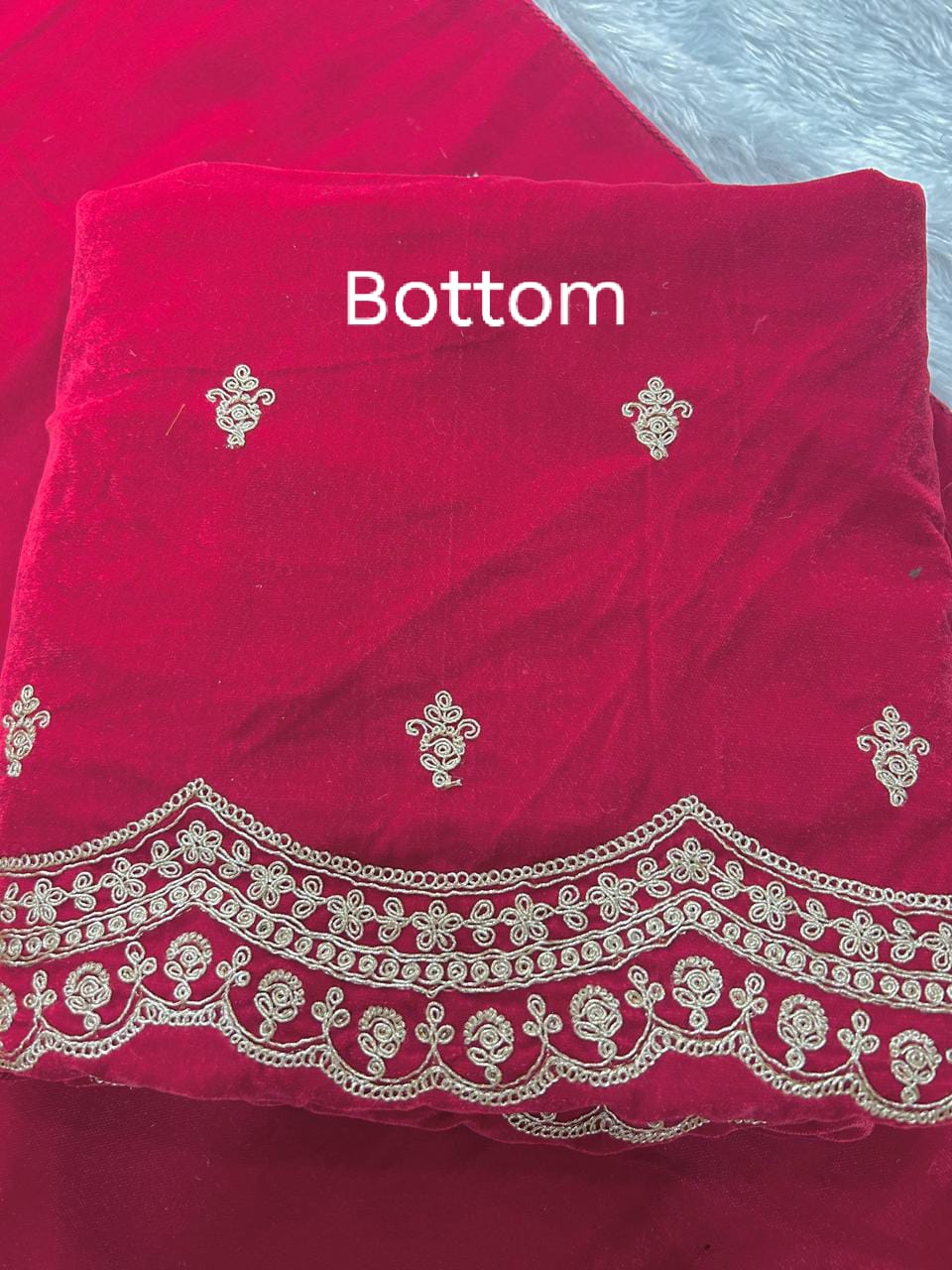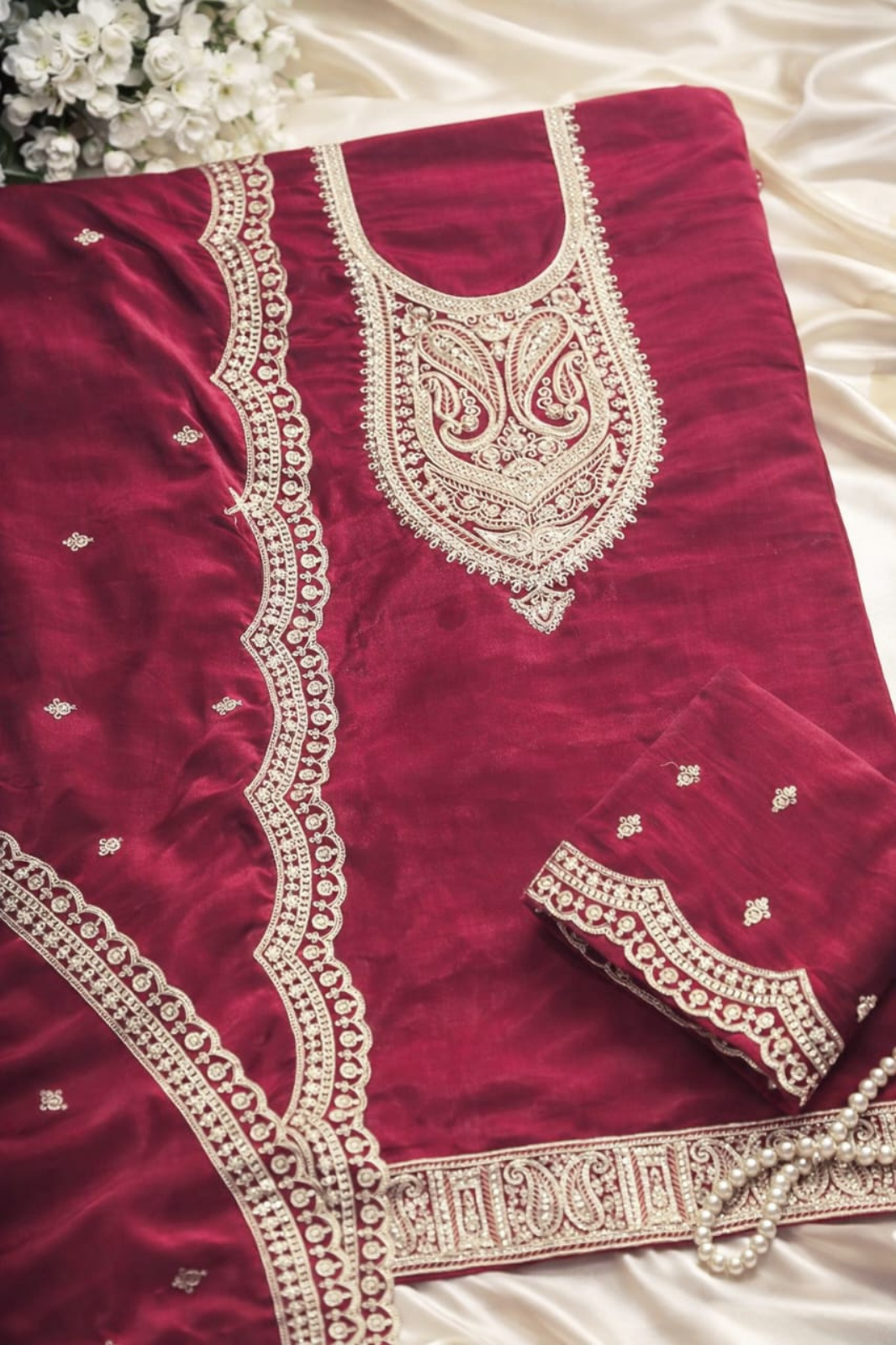 The matching velvet bottom complements the kurta perfectly, while the coordinated dupatta, adorned with an ornate embroidered border and subtle motifs, completes the ensemble with grace. This unstitched set offers the flexibility to tailor the outfit to your preferred fit and silhouette, making it ideal for weddings, festive celebrations, and elegant evening wear.