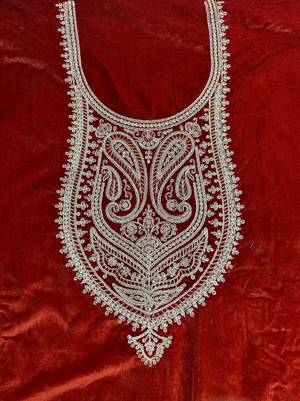 Elevate your festive wardrobe with this stunning royal rust 9000 velvet unstitched suit set, designed for timeless elegance and celebratory grandeur. Crafted from rich, plush 9000 velvet, the kurta is beautifully adorned with intricate embroidery on the neckline, front panel, side border and hem, creating a regal and sophisticated look. Delicate embroidered motifs scattered across the fabric add a touch of handcrafted charm.