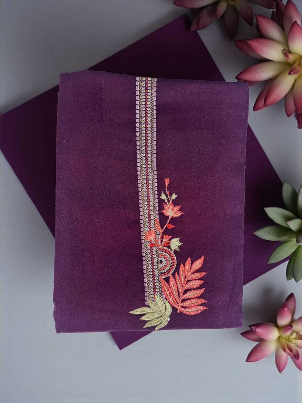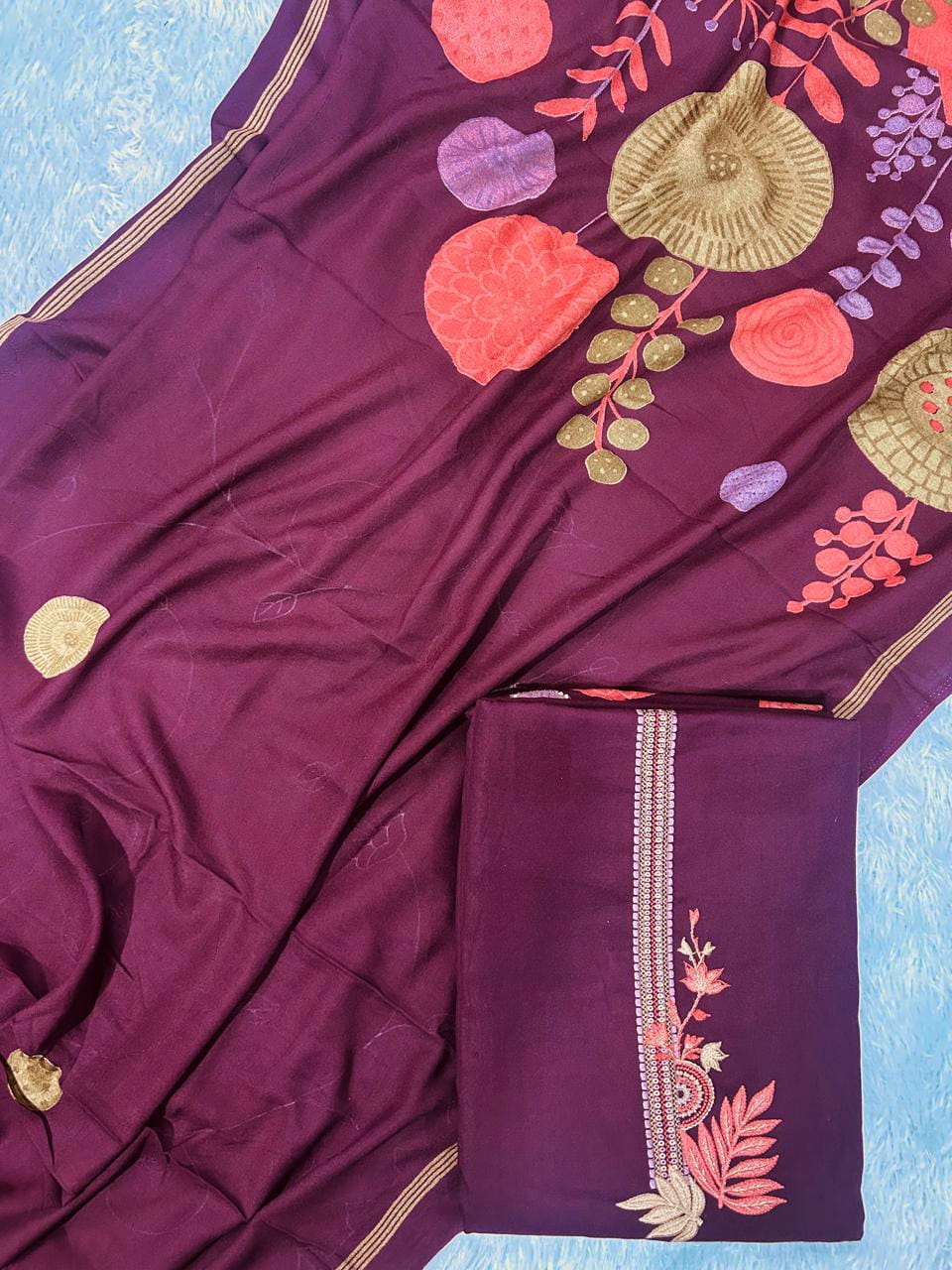 A premium wine-coloured Pashmina suit featuring detailed neckline embroidery and soft leaf-floral motifs. This winter-perfect suit provides excellent warmth while giving a graceful and festive ethnic look.